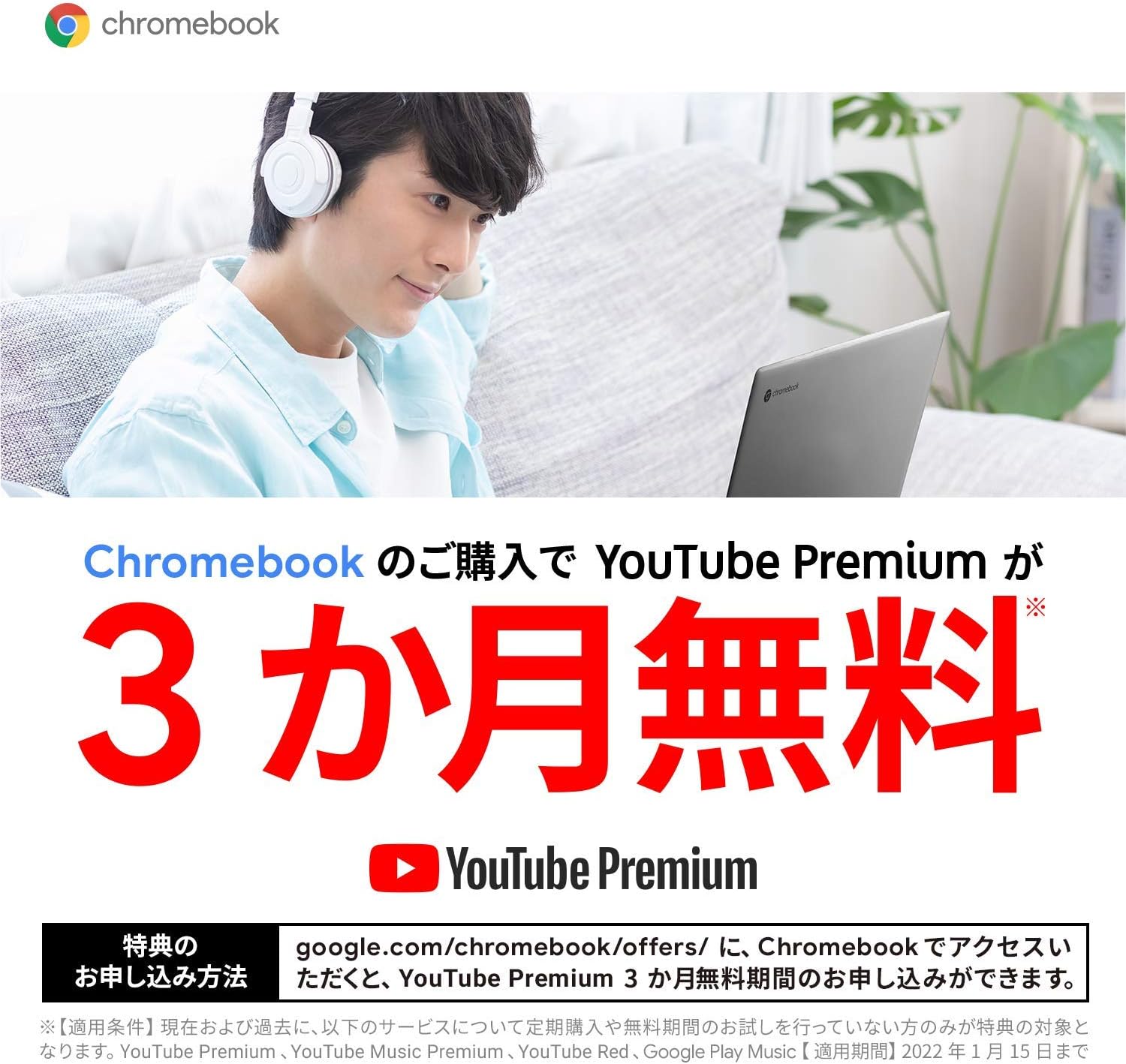 特典として、Chromebookを購入すると、YouTube Premiumに3ヶ月間無料お試し加入できます。